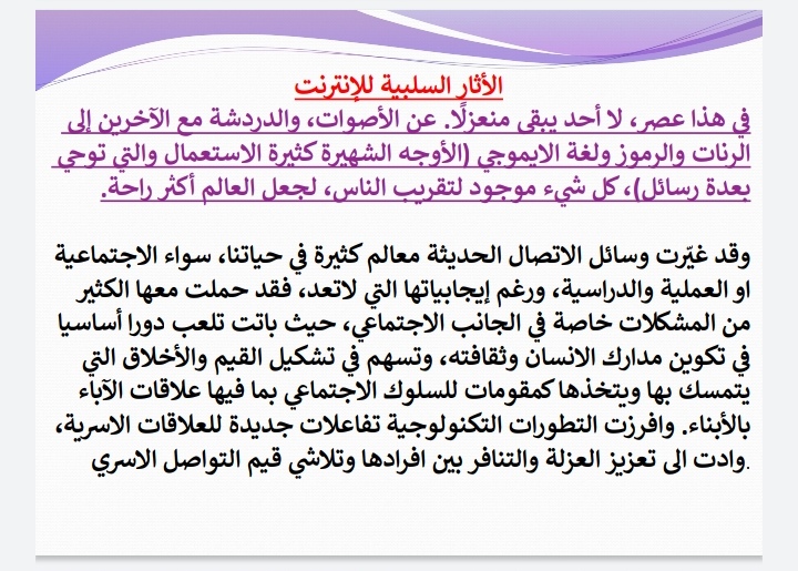 وقد قدمت بمشاركة طالبات النادي الثقافي حيث شملت آثار مواقع التواصل الإيجابية والسلبية ومدي تأثيرها علي علاقة أفراد الأسرة وقد تطرقت الورشة لجميع أوجه المشكلة واقترحت مجموعة من الحلول لمواجهة الظاهرة التي أصبحت آمرًا واقعًا في ظل جائحة كرونا وضرورة التعامل مع النت في جميع أنحاء العالم .
