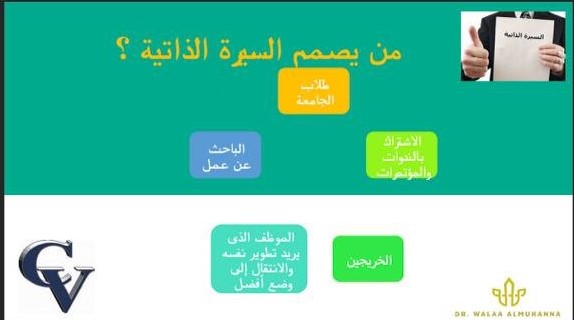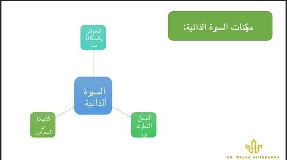 من تقديم الدكتورة/ ولاء المهنا -الأستاذ المساعد بقسم العلوم التربوية-وتهدف إلى تعلم فنون ومهارات كتابة السيرة الذاتية المميزة ، كما تناولت المحاور التالية: