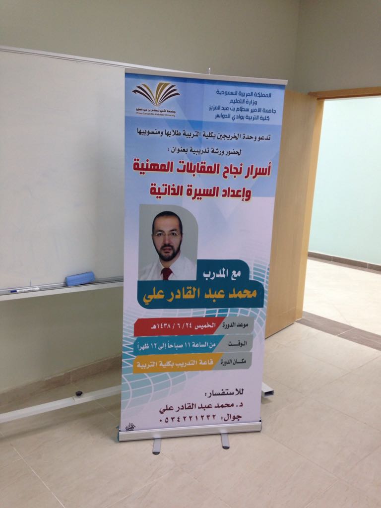 حرصًا على رفع كفاءة ومهارات الطلاب عقدت ورشة تدريبية بعنوان "أسرار نجاح المقابلة المهنية" بكلية التربية بمحافظة وادي الدواسر أدار الورشة عضو هيئة التدريس بكلية التربية الدكتور / محمد عبدالقادر علي وذلك بقاعة التدريب بكلية التربية بوادي الدواسر وقد استهدفت طلاب الكلية بوجه عام والخريجين بوجه خاص .