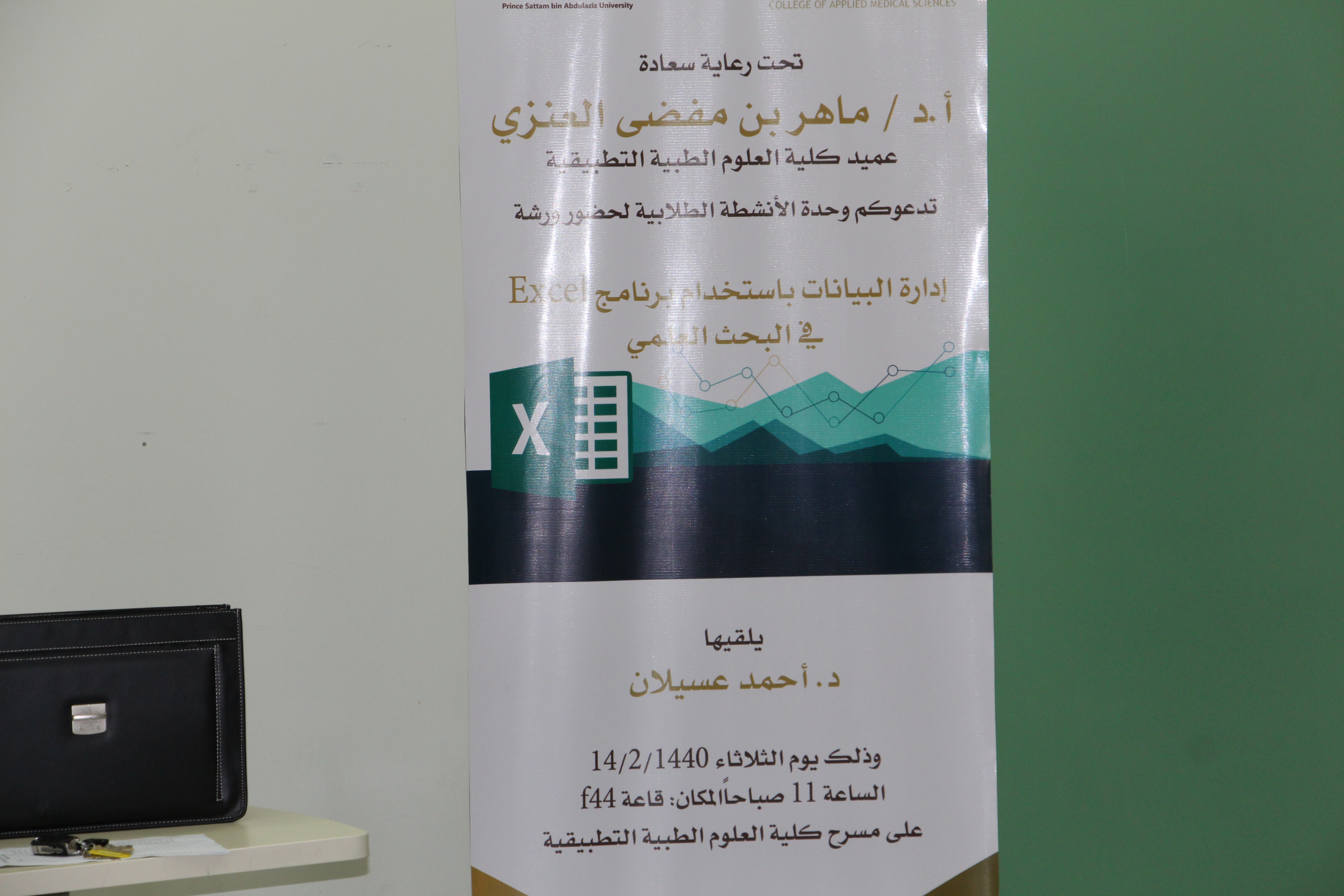 أقامت كلية العلوم الطبية التطبيقية ورشة تدريبية حول إدارة البيانات باستخدام برنامج الأكسل في البحث العلمي، ألقاها سعادة الدكتور أحمد عسيلان.