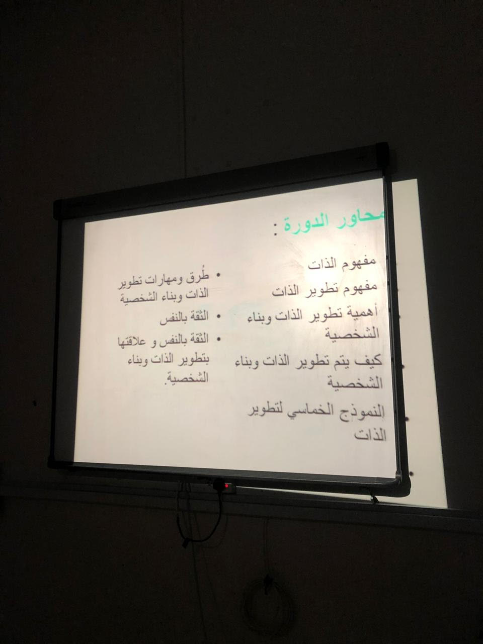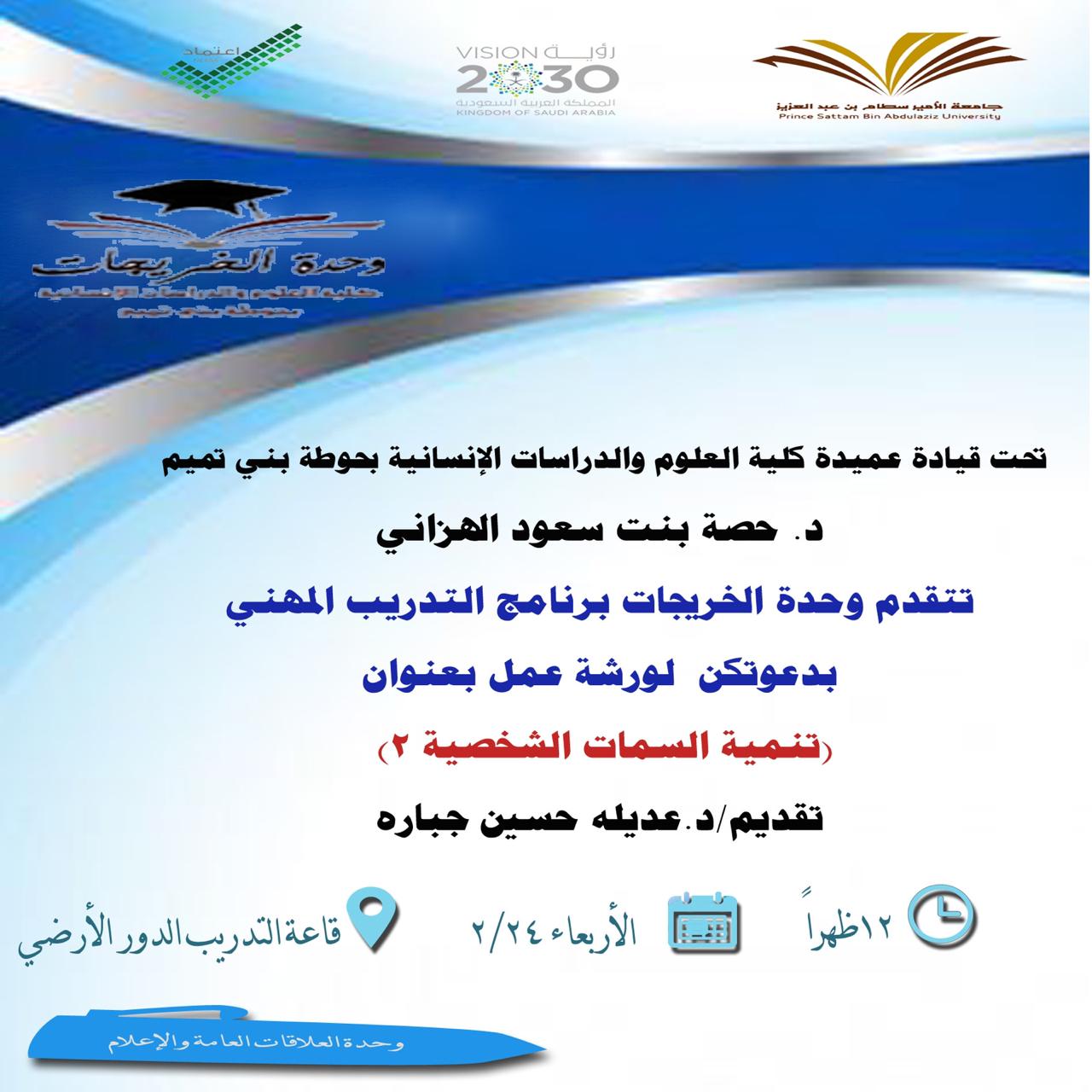 أقامت وحدة الخريجات متمثلة ببرنامج التدريب المهني بكلية العلوم والدراسات الإنسانية بحوطة بني تميم ورشة عمل عن ( تنمية السمات الشخصية ٢ )تحت رعاية عميدة الكلية سعادة الدكتورة/ حصة بنت سعود الهزاني، وذلك يوم الأربعاء الموافق: ٢٤/ ٢/ ١٤٤١هـ في قاعة التدريب بالكلية، وقد قدمتها الدكتورة/ عديلة حسين جباره الأستاذ المساعد بقسم التربية وعلم النفس ، وقد حضر الورشة ثلاثون طالبة ونيفا ، حيث تعرفن على مفهوم الذات و تطويرها وأهمية ذلك في بناء الشخصية وطرق و مهارات تطوير الذات و بناء الشخصية النموذج الخماسي لتطوير الذات ومفهوم الثقة بالنفس و علاقتها بتطوير الذات وبناء الشخصية ، وقد لقي البرنامج تفاعلا وقبولا لدى الجميع.