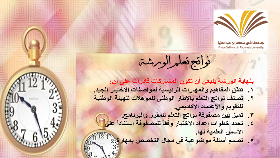 وتمثلت نواتج تعلم الورشة في أن تكون المشاركات قادرات على أن تتقن المفاهيم والمهارات الرئيسية لمواصفات الاختبار الجيد - تصنف نواتج التعلم بالإطار الوطني للمؤهلات للهيئة الوطنية للتقويم والاعتماد الأكاديمي - تميز بين مصفوفة نواتج التعلم للمقرر والبرنامج- تحدد خطوات إعداد الاختبار وفقاً للمصفوفة استناداً على الأسس العلمية لها - تصمم أسئلة موضوعية في مجال التخصص بمهارة.