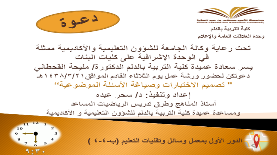 تحت إشراف وكالة الجامعة للشؤون التعليمية والأكاديمية ممثلة في الوحدة الإشرافية على كليات البنات،وبناء على توجيهات عميدة الكلية الدكتورة/ مليحة القحطاني بشأن التطوير المستمر للهيئة التدريسية ، وفقاً لاستراتيجيات التدريس وأساليب التقويم الحديثة ، نظم قسم العلوم التربوية بالتعاون مع وحدة التدريب والتطوير بالجودة ورشة تدريبية بعنوان ( تصميم الاختبارات وصياغة الأسئلة الموضوعية ) من إعداد وتقديم د.سحر عبده أستاذ المناهج وطرق تدريس الرياضيات المساعد ومساعدة العميدة للشؤون التعليمية والأكاديمية ، وذلك يوم الثلاثاء الموافق 21 /3/1438هـ بمعمل وسائل وتقنيات التعليم بالكلية .