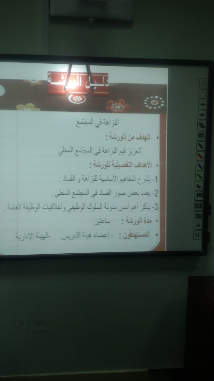 نظمت وحدة التخطيط والتطوير بوكالة كلية التربية بالدلم للتطوير والجودة ورشة عمل بعنوان: تعزيز قيم النزاهة في المجتمع من خلال رؤية المملكة 2030 يوم الاحد الموافق:١٤٤٠/٥/٢٨هـ في قاعة الورش التدريبية بالكلية،من إعداد وتقديم د/ فاطمة شاذلي عبد العال-عضو هيئة التدريس بقسم الإقتصاد المنزلي.