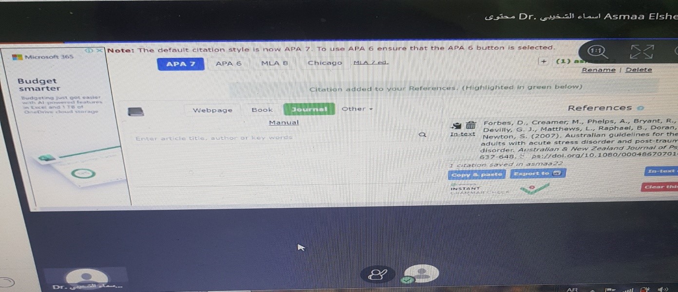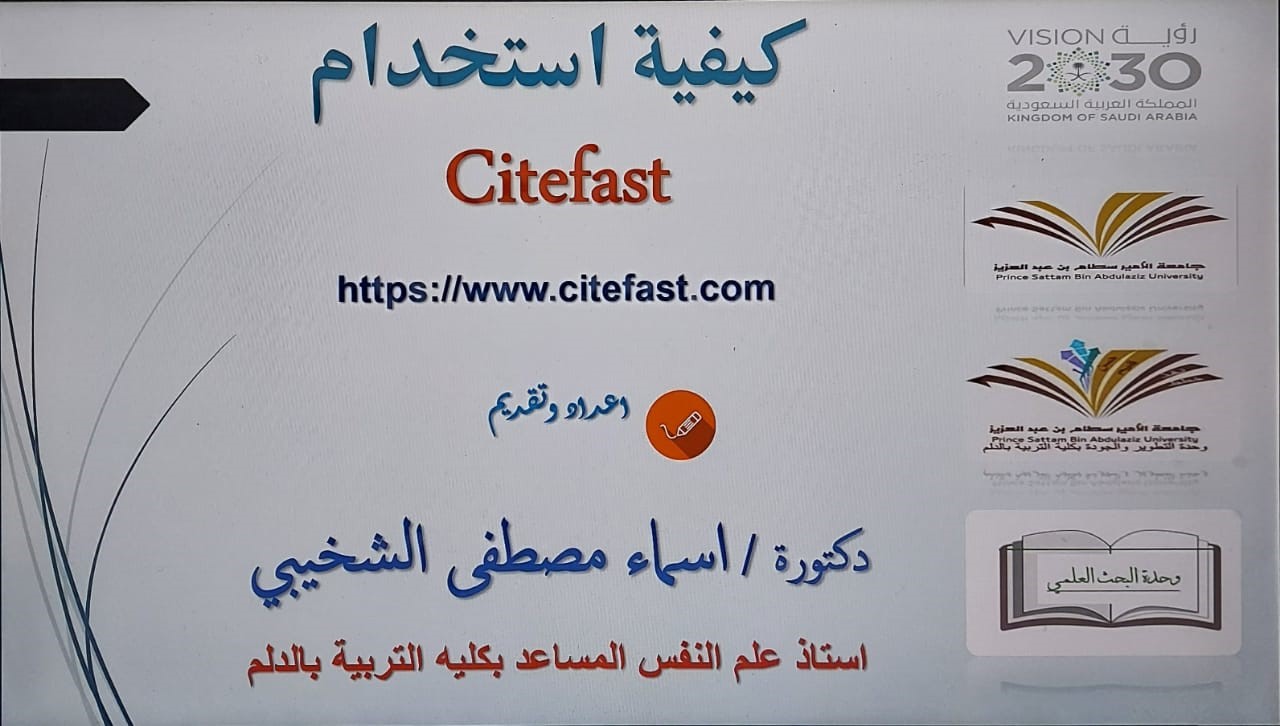 أقامت وحدة البحث العلمي التابعة لوكالة الدراسات العليا والتطوير والجودة بالتعاون مع قسم علم النفس بكلية التربية بالدلم ورشة بعنوان "كيفية استخدام Cite fast "وذلك يوم الثلاثاء الموافق 19 /2/1442 هـ عبر برنامج البلاك بورد، قدمتها الدكتورة أسماء الشخيبي- أستاذ علم النفس المساعد – استهدفت أعضاء الهيئة التعليمية، بهدف تعريفهم على كيفية استخدام Cite fast وكيفية توثيق المراجع العلمية والبحث التلقائي عن المجلات والكتب وصفحات الويب مع تطبيق العملي للورشة.
