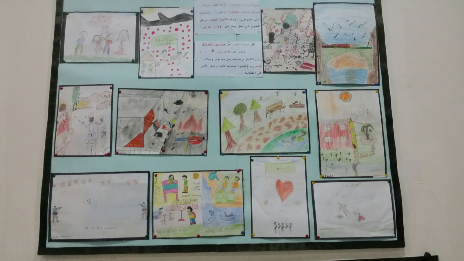 كماعرضت مجموعة من رسومات الاطفال عبرت عن مشاعرهم تجاه الحروب والسلام .