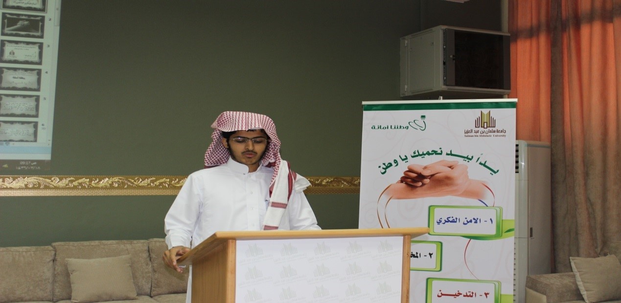 و قد استهل التدشين بآيات عطرة من القرآن الكريم , تلتها مقدمة ترحيبية بالحضور الكرام , ثم كلمة لعميد الكلية ، ثم قٌدمت نبذة تعريفية بالمشروع قدمها الدكتور ناصر العشوان وكيل الكلية ، واختتم اللقاء سعادة الدكتور مبارك الحماد وكيل الجامعة للفروع والذي عبر عن سعادته بانطلاق هذا المشروع ، وأضاف ان تدشين حملة تعزيز القيم الوطنية (وطننا أمانة) تأكيد على أن الطالب الجامعي شريك في التنمية وأساس لكل نهضة وبه تتحقق المواطنة الصالحة.