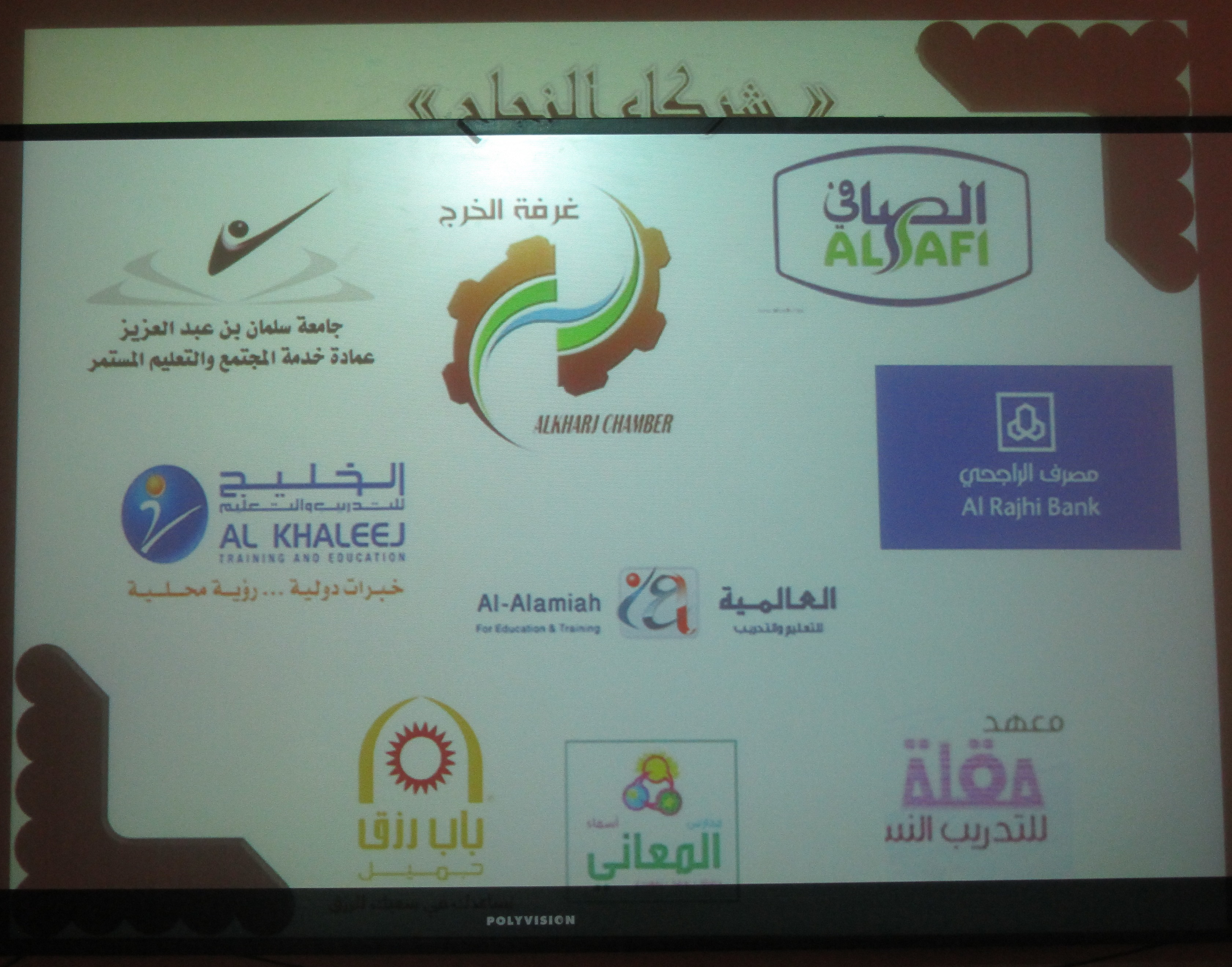 فقد كان اللقاء بحضور عدد من شركاء النجاح من الشركات والمعاهد الرائدة من (عمادة خدمة المجتمع, الغرفة التجارية بالخرج, شركة الصافي للألبان, معهد العالمية ,معهد الخليج, روضة وإبتدائية أسمى المعاني) .