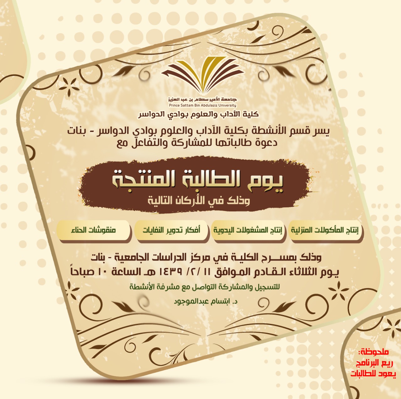 تنظم كلية الاداب والعلوم بوادي الدواسر ( شطر الطالبات ) ممثلة بقسم الأنشطة بالكلية المعرض الأول ( يوم الطالبة المنتجة ) ، وذلك على مسرح الكلية بمركز الدراسات الجامعية ( طالبات ) يوم الثلاثاء الموافق ١٤٣٩/٢/١١هـ .