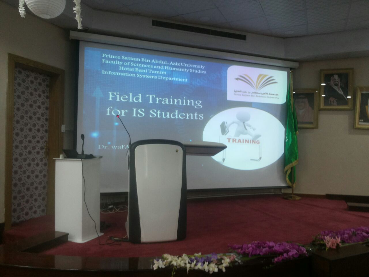 أقام قسم نظم المعلومات بكلية العلوم والدراسات الإنسانية بحوطة بني تميم ممثلًا بمنسقة التدريب الميداني بقسم نظم المعلومات أ. وفاء حمزة يوم الأحد الموافق 22/ 5/ 1438هـ في تمام الساعة الثانية عشر ظهرًا يومًا تعريفيًا يهدف إلى تعريف الطالبات بالتدريب الميداني لتطوير المهارات التقنية والمهنية للطالبات وزيادة المعرفة للطالبة في الحقل العملي كما يهدف إلى إعداد الطالبة للوظيفة الحقيقية وتهيئتها لسوق العمل. كما تم توضيح بأن التدريب الميداني ما هو إلا دورة إلزامية مطلوبة للحصول على درجة البكالوريوس وفقا للخطة الدراسية للطالبة كما تم تعريف الطالبات بالهدف من التدريب الميداني والمتطلبات واللوائح الخاصة بالتدريب الميداني و كيفية التقييم.
