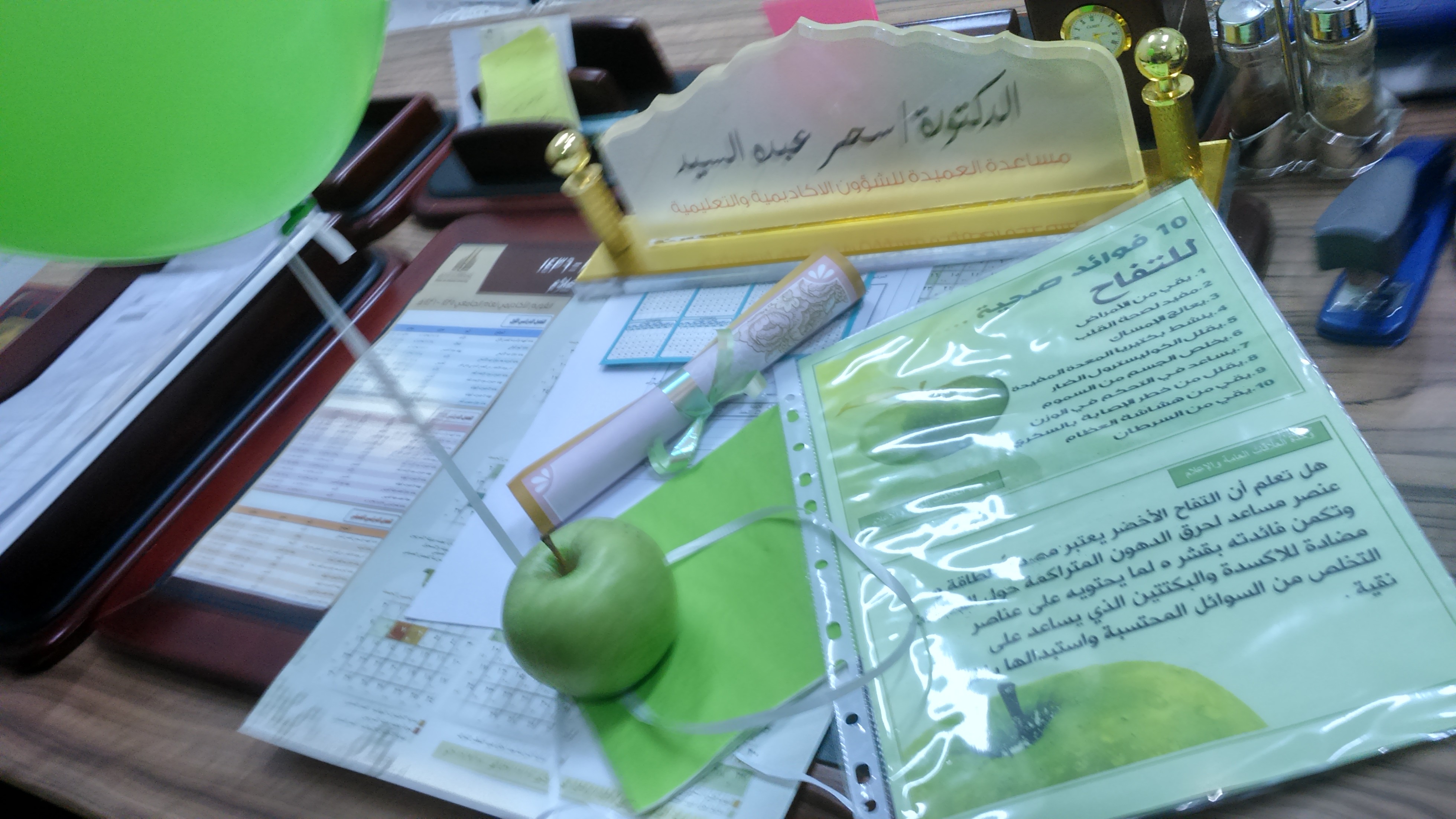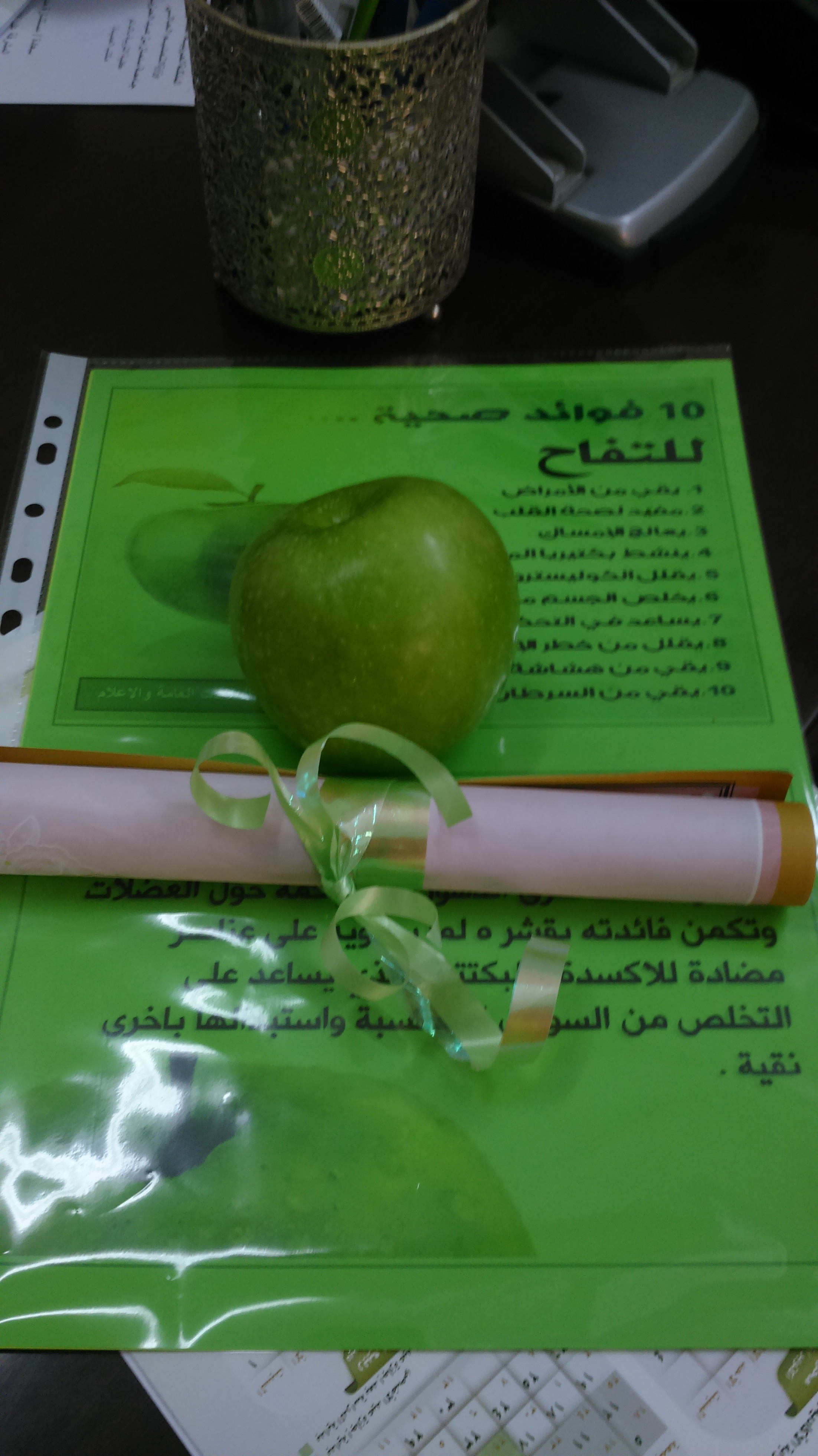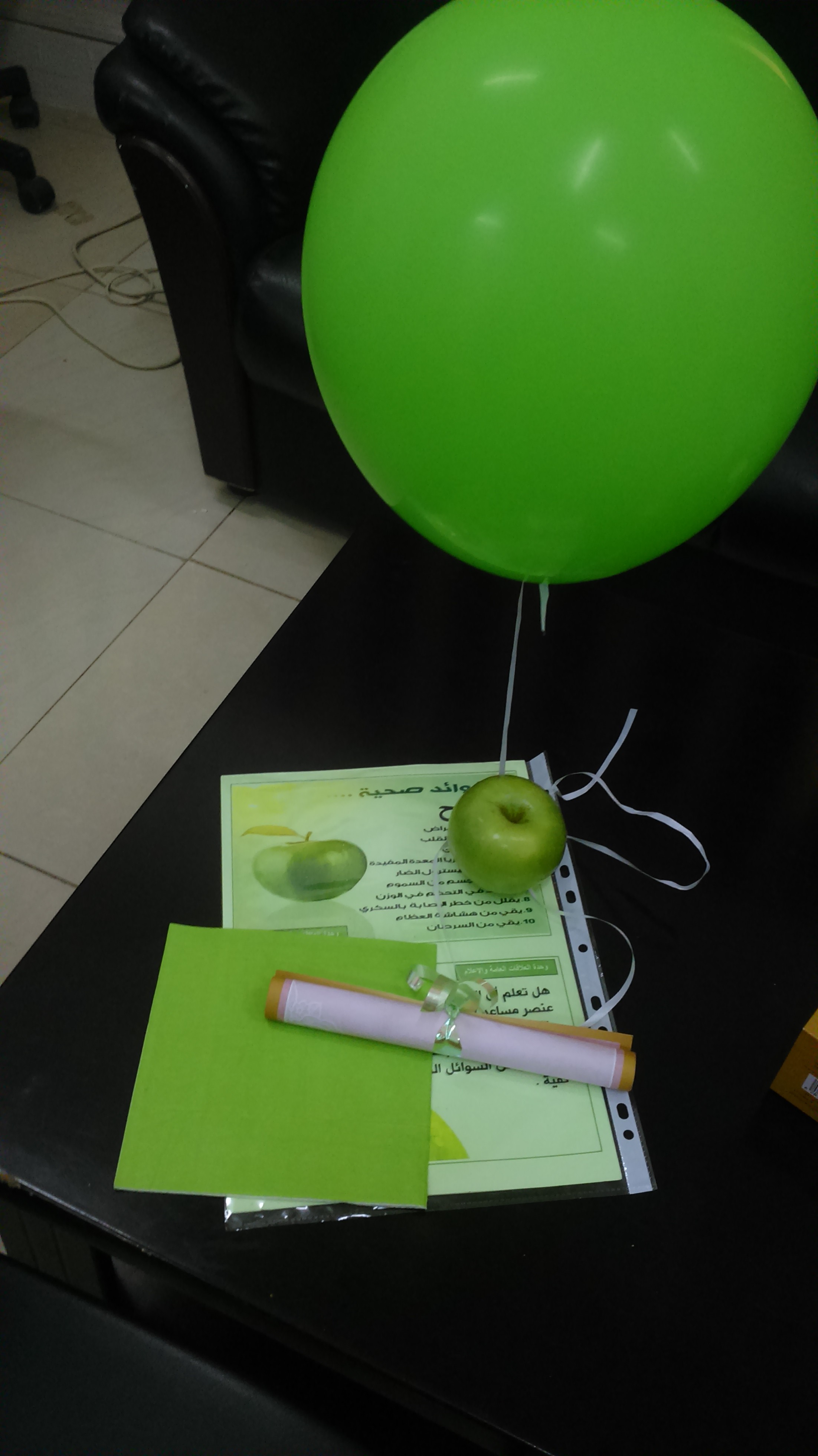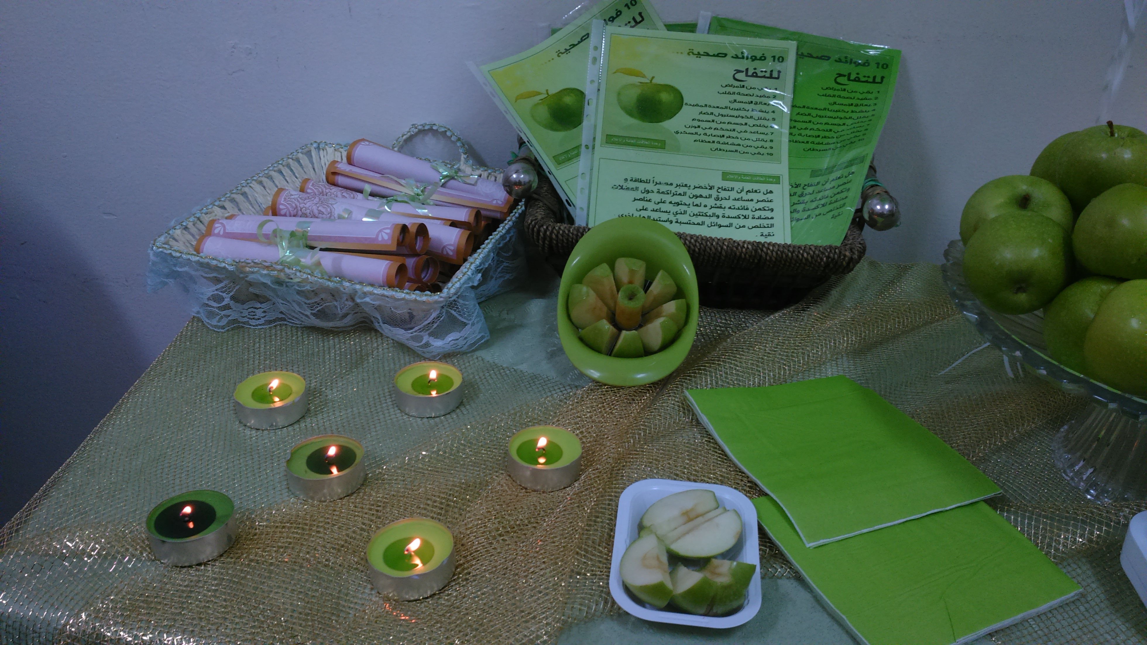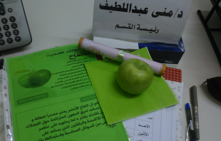 تم خلال اليوم توزيع المنشورات والمطويات ، و التفاح الأخضر على منسوبات الكلية في مكاتبهن مع إعطاء نبذة موجزة عن أهمية التفاح الأخضر وإيصال رسالة ودعوة للجميع إلى تغير عادتنا الغذائية إلى كل ما هو صحي ومفيد .