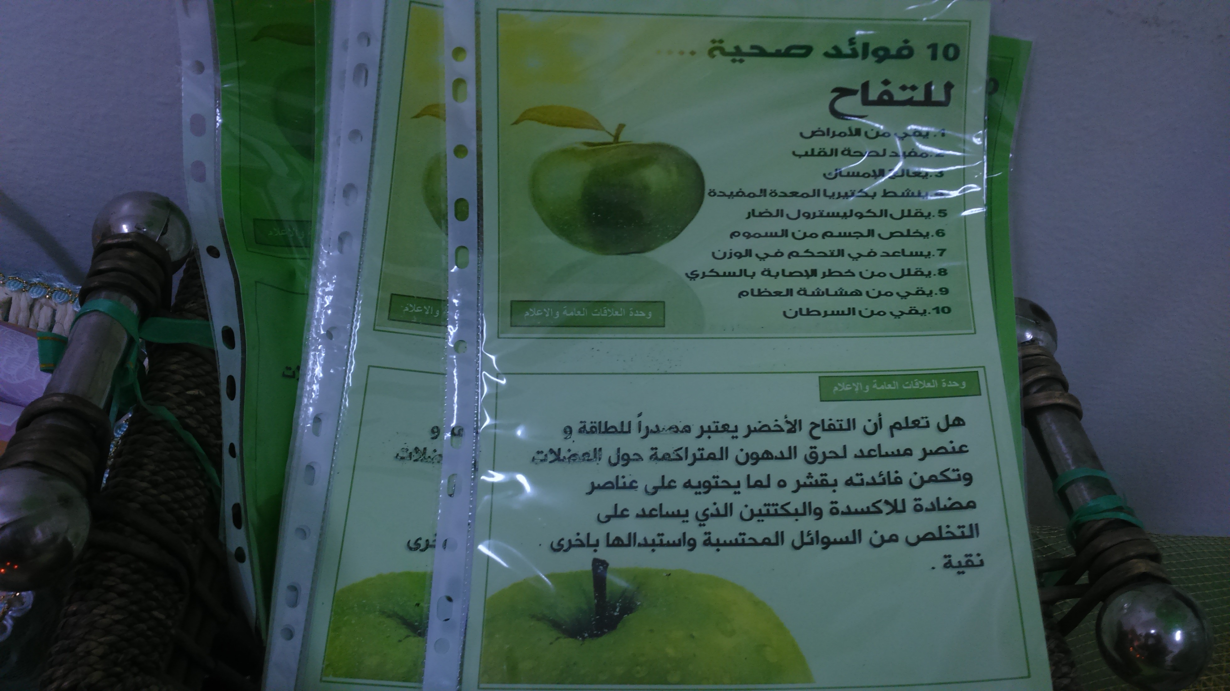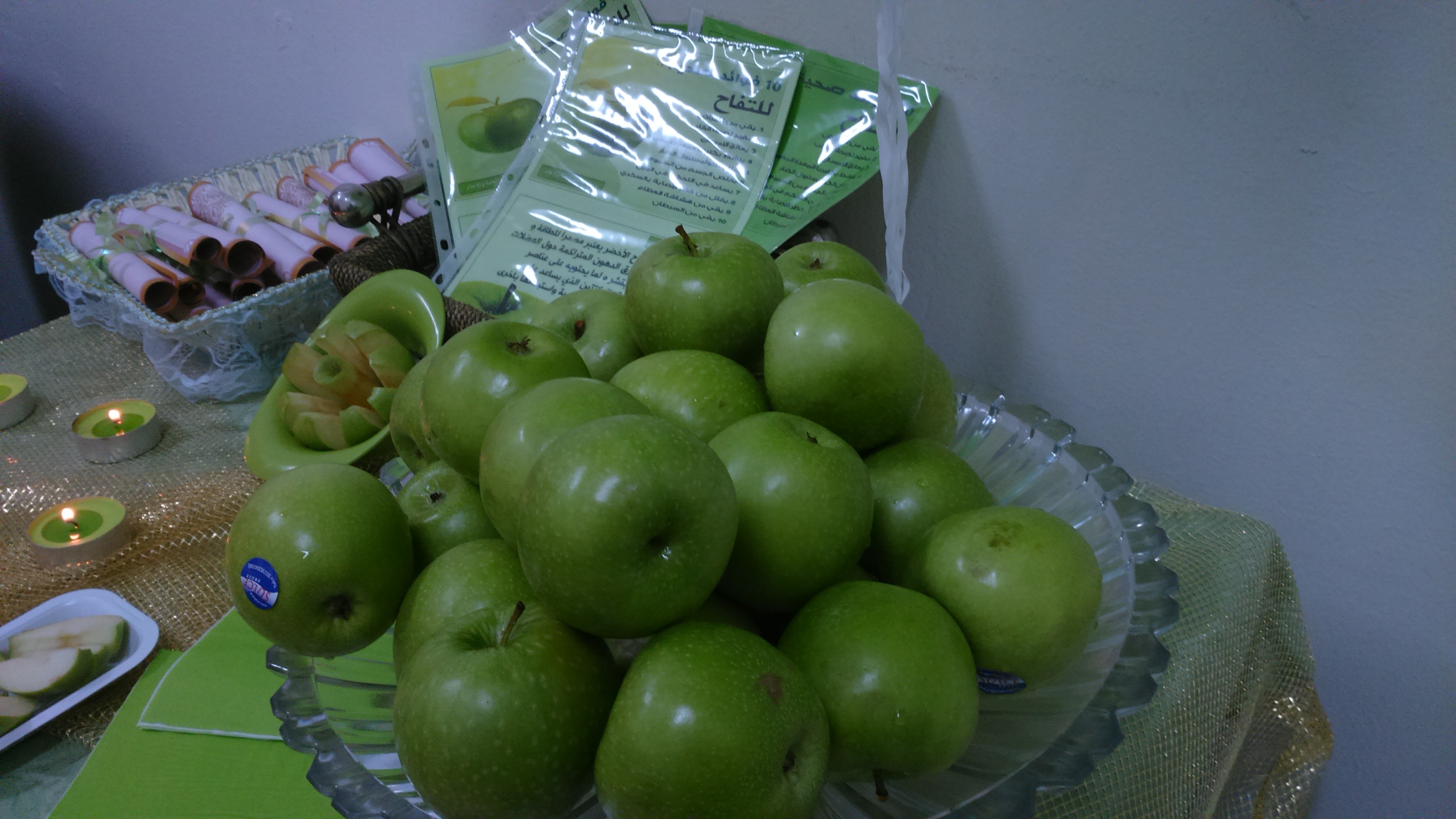 ضمن خطة العلاقات العامة والإعلام الهادفة إلى نشرالثقافة والتوعية الغذائية السليمة بين منسوبات الكلية وتحت إشراف مشرفة الوحدة أ. سارة الدوسري تم في يوم الثلاثاء الموافق 1436/12/30هـ الساعة التاسعة صباحاً، تفعيل يوم التثقيف الغذائي من خلال اقامة ركن توعوي بأهمية التفاح الأخضر وتسليط الضوء بشكل أكبر على حجم الفوائد العظيمة للتفاح الأخضر لصحة الجسم وفوائده العديدة في معالجة والوقاية من الأمراض .