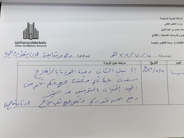 قامت لجنة من عمادة التطوير والجودة بقسمها النسائي بزيارة لكلية العلوم والدراسات الإنسانية بالأفلاج يوم الخميس الماضي 1437/7/7 هـ وكان في استقبالهم د.وصال عز الدين مساعدة العميد للشؤون الأكاديمية و د. مي مصطفى مديرة وحدة التطوير والجودة , حيث اجتمعت اللجنة بمشرفات الأقسام وأعضاء هيئة التدريس و الطالبات , وقمن بجولة على مرافق الكلية , و استمعن للجميع سعياً لضمان تطبيق معايير الجودة , و تهيئة بعض الأقسام للاعتماد الأكاديمي .