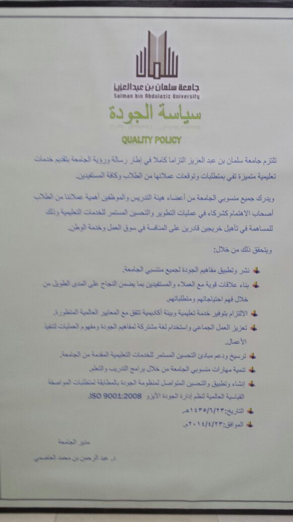 برعاية عميدة الكلية د.حنان الجهني استقبلت كلية التربية بالدلم يوم الاربعاء 1436/3/23هـ معهد المواصفات البريطاني (BSI) في إطار مشروع إنشاء وتطبيق نظام إدارة الجودة وتأهيل الجامعة للحصول على شهادة المطابقة (ISO 9001 :2008 ). فقد تم اختيار كلية التربية بالدلم كنموذج بناءً على زيارة الفريق المكون من د.يحيى أبو عبيلة- المدقق الخارجي من (BSI) ، وأ. مرسي ابراهيم- سليمان مدرب واستشاري بوحدة الأيزو بوكالة التطوير والجودة بجامعة سلمان بن عبدالعزيز.