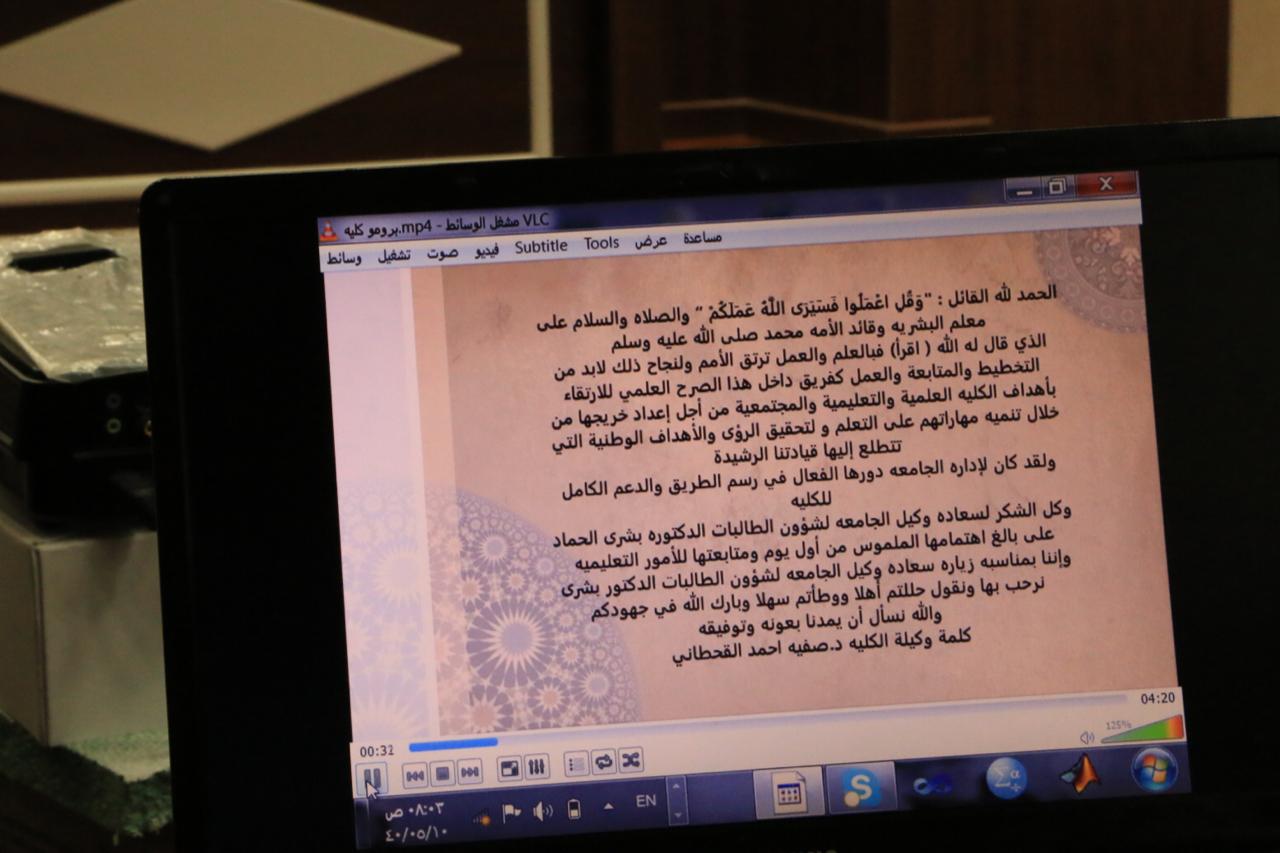 تم إجتماع سعادة وكيلة الجامعة والوفد المرافق بها و وكيلة الكلية ومساعدة الوكيلة ومديرة الإدارة ومديرة إدارة شؤون الطالبات وقد تضمنت الجلسة عرضاً موجز لأبرز الأنجازات وتم تقديم تقرير بإنجازات الكلية تضمنت انجاز الهيئة الإدارية والاكاديمية والوحدات ثم بدء البرنامج الترحيبي المقام بالمسرح التي بدأت به الطالبة مها محمد الشهري ثم آيات من الذكر الحكيم ثم ألقت وكيلة الكلية الدكتورة صفيه القحطاني كلمه ترحيبيه وشُكر لأهتمام وكيلة الجامعة ثم تقدمت وكيلة الجامعة لشؤون التعليمية والأكاديمية الدكتورة بشرى الحماد وقد أشادت بحفاوة الاستقبال وبشكر لجميع الهيئة التدريسية والإدارية .