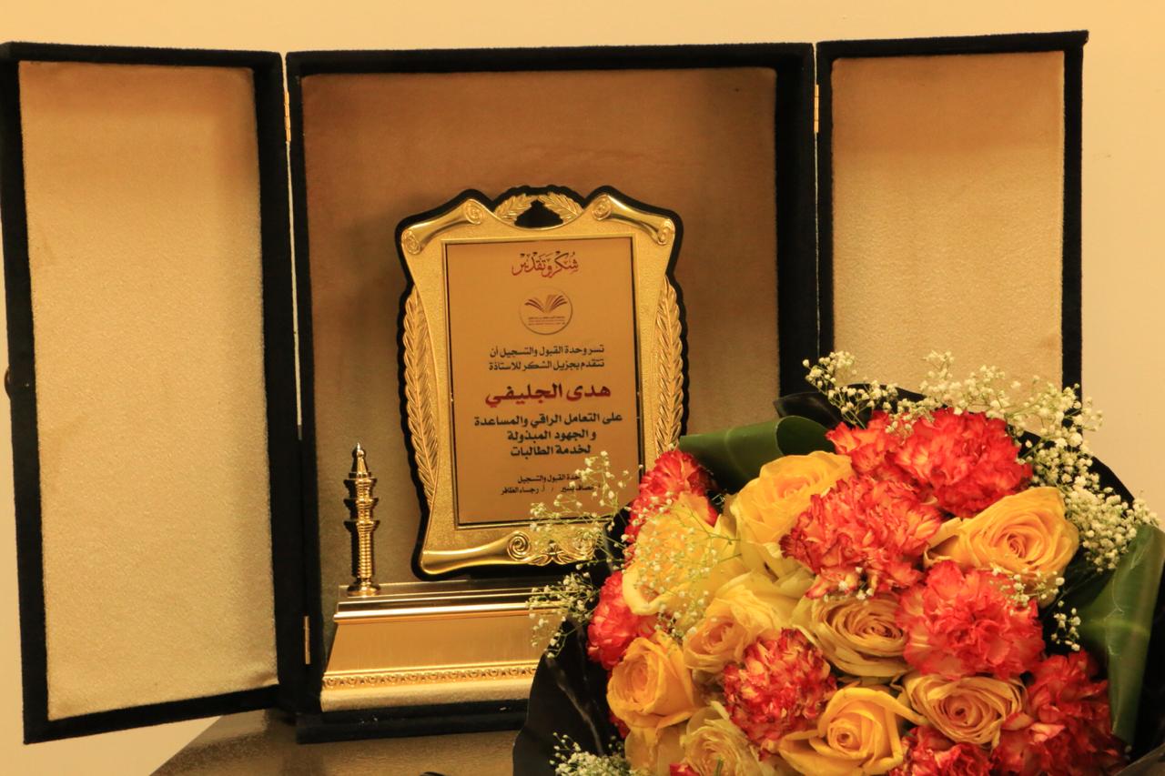 وفي نهاية اللقاء قدمت الدكتورة صفية القحطاني درع تكريمي لزيارتها شكرت الدكتورة بشرى الحماد الوفد المرافق لها على الإنجاز وأشادت على جهودهم المتميزة والعمل بروح الفريق.