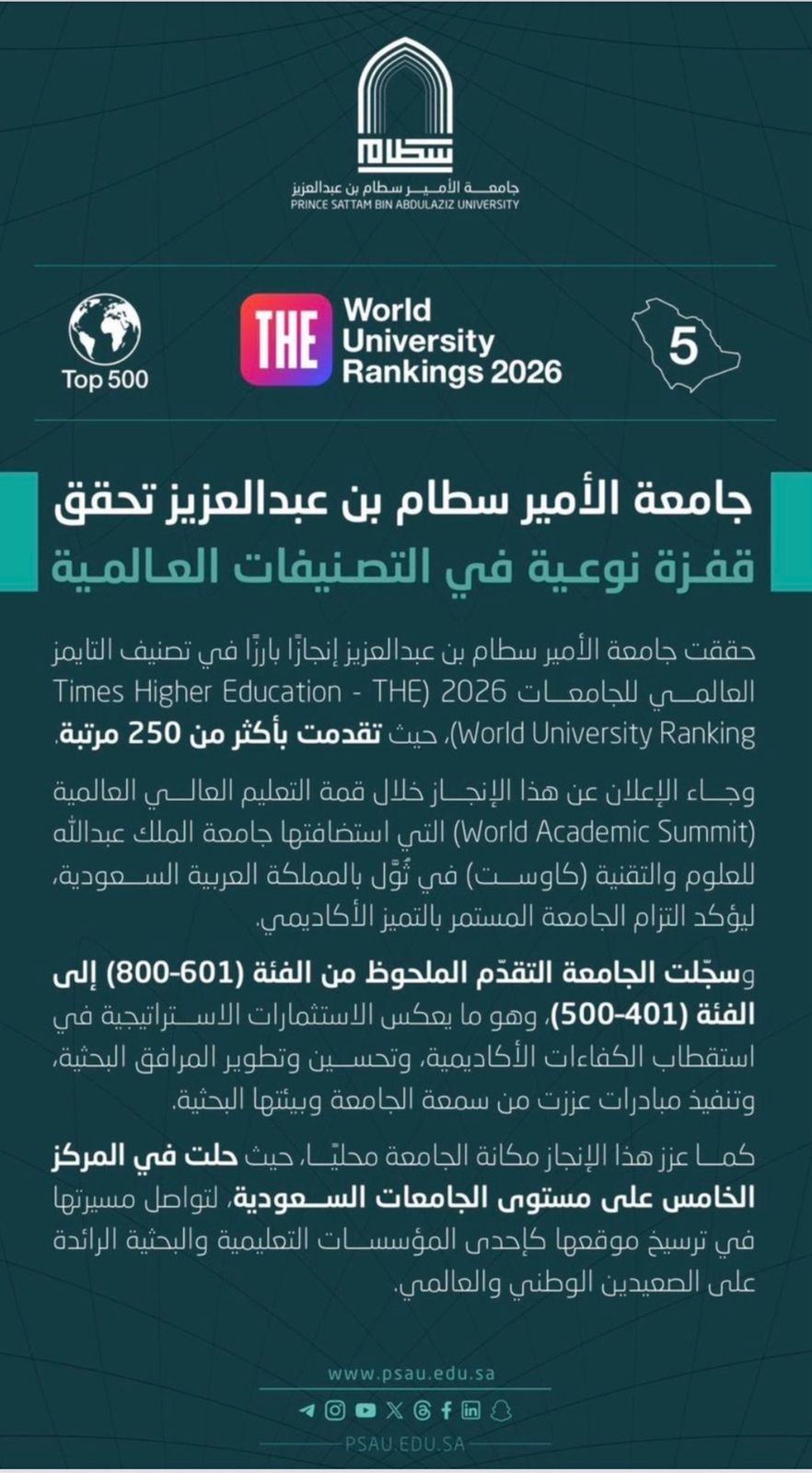 Prince Sattam bin Abdulaziz University (PSU) has achieved a new national milestone by advancing more than 250 places in the Times Higher Education (THE) World University Rankings 2026, reaching the 401-500 global rankings, placing fifth among Saudi universities.